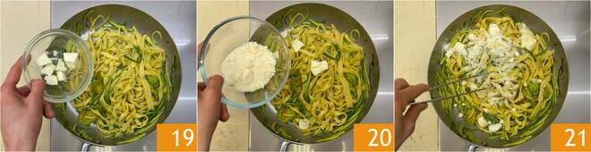 Éteignez le feu, ajoutez le beurre 19, le parmesan râpé 20 et mélangez bien 21.