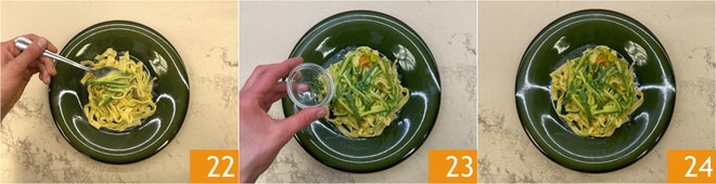 Dressez dans les assiettes 22 et complétez avec du thym frais 23. Les tagliatelles aux fleurs de courgette sont prêtes à être dégustées 24.