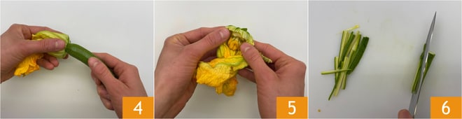 Pendant ce temps, séparez les courgettes des fleurs 4, retirez le pistil des fleurs 5 et coupez les courgettes en julienne 6.