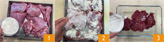 Pour réaliser les tagliolini au ragoût de lapin et champignons, commencez par préparer le bouillon de légumes (ou de viande) et gardez-le au chaud. Farinez les morceaux de lapin 1 et enlevez l'excès de farine 2. Faites de même avec le foie 3.