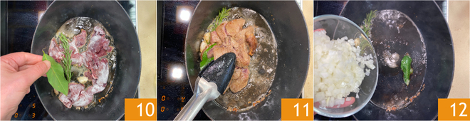 Aromatisez avec le romarin et le laurier 10 et faites bien rissoler, puis retirez également le foie de la cocotte 11 et réservez-le. Il est important que le fond de cuisson ne brûle pas. À ce stade, versez dans la cocotte l'oignon haché 12.