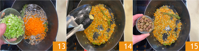 Ajoutez également la carotte et le céleri hachés auparavant 13, puis laissez revenir à feu doux pendant une dizaine de minutes. Lorsque les légumes se sont ramollis, retirez l'ail 14 et ajoutez les olives taggiasches 15.