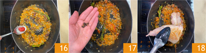 Assaisonnez avec le concentré de tomate 16 et mélangez bien pour le faire toaster, puis aromatisez avec les baies de genièvre légèrement écrasées 17. À ce stade, remettez les morceaux de lapin dans la cocotte 18.