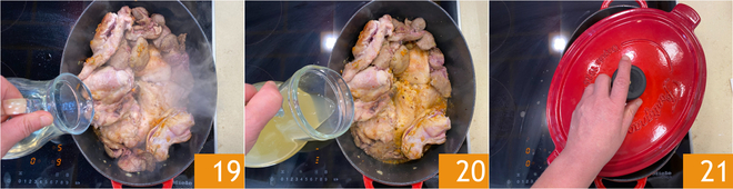 Déglacez avec le vin blanc 19 et laissez évaporer complètement, puis couvrez avec le bouillon 20. Faites cuire doucement avec le couvercle, en laissant un petit espace, pendant environ une heure et demie 21.
