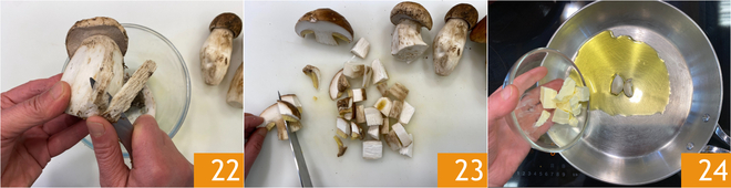 Entre-temps, occupez-vous des champignons : nettoyez les cèpes en enlevant la partie terreuse du pied 22, puis coupez-les en dés d'environ 2 cm 23. Gardez un demi-cèpe de côté à ajouter cru au plat fini. Dans une poêle, faites fondre le beurre avec l'huile et 2 gousses d'ail 24.