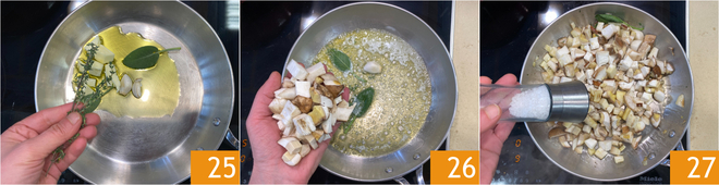 Aromatisez avec le thym et la sauge 25, puis ajoutez les champignons 26 et salez 27. Faites rissoler à feu vif pendant environ 3 minutes.