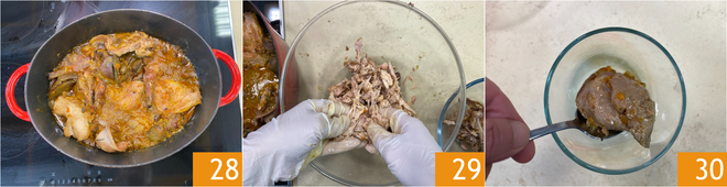 Une fois le temps de cuisson du lapin écoulé 28, ajustez le sel. Retirez la viande de la cocotte et effilochez-la avec les mains, en prenant soin d'éliminer tous les petits os 29. Réservez la viande effilochée et mettez le foie doré précédemment dans un récipient 30.