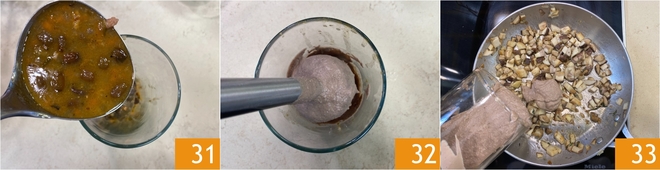 Ajoutez une louche du fond de cuisson du lapin 31 et mixez avec un mixeur plongeant pour obtenir une sauce crémeuse et homogène 32. Lorsque les champignons sont bien rissolés, ajoutez la sauce ainsi réalisée 33.