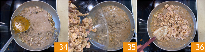 Versez également une louche du fond de cuisson du lapin 34 et mélangez bien, puis ajoutez la viande effilochée 35 et amalgamez brièvement le tout à feu doux 36.
