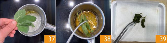 Pendant que vous portez l'eau à ébullition pour cuire les pâtes, occupez-vous de la sauge croustillante : faites fondre le beurre dans une petite casserole, ajoutez les feuilles de sauge 37 et faites-les rissoler pendant 3-4 minutes 38 jusqu'à ce qu'elles deviennent bien croustillantes. Transférez-les sur du papier absorbant 39 et réservez.