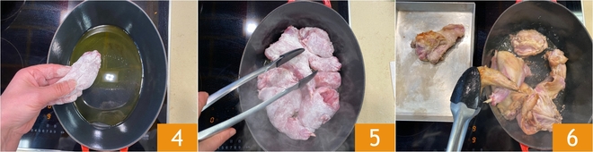 Dans une cocotte en fonte, chauffez l'huile et disposez les morceaux de lapin farinés 4. Faites dorer la viande de tous les côtés pendant 6-7 minutes à feu vif, elle ne doit pas trop brunir 5. Si vous voyez qu'elle se colore trop, baissez le feu. Une fois doré, retirez le lapin de la cocotte et réservez-le 6.