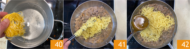 Salez l'eau en ébullition et faites cuire les tagliolini 40. Dès qu'ils remontent à la surface, égouttez les tagliolini dans la poêle avec l'assaisonnement 41 et arrosez d'une louche du fond de cuisson du lapin 42. Mélangez brièvement et éteignez le feu.