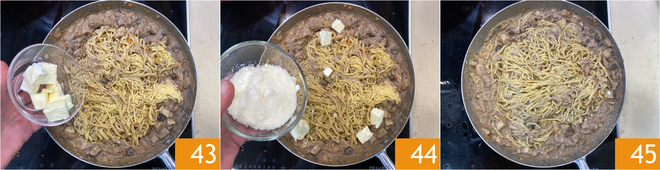Ajoutez le beurre 43 et le Parmigiano Reggiano râpé 44 et amalgamez le tout 45.