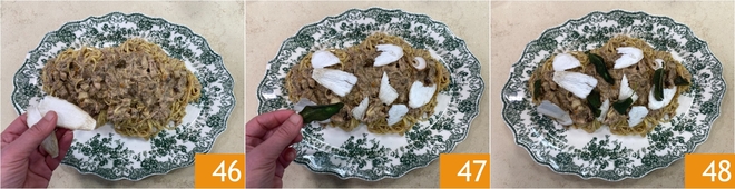 Dressez les tagliolini et garnissez avec le cèpe cru réservé coupé en lamelles 46, puis complétez avec les feuilles de sauge croustillante 47. Vos tagliolini au ragoût de lapin et champignons sont prêts à être servis 48 !
