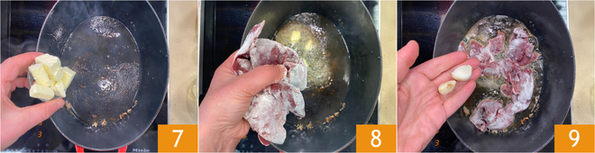 Dans la même cocotte, ajoutez le beurre 7, le foie fariné 8 et une gousse d'ail 3.