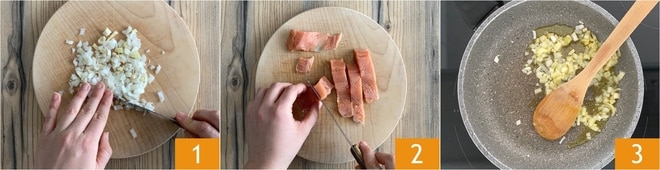 Pour préparer les tagliolini au saumon, commencez par mettre une casserole d'eau sur le feu pour cuire les pâtes, et salez à ébullition. Nettoyez et hachez finement l'oignon nouveau 1. Retirez la peau du filet de saumon, enlevez les arêtes avec une pince de cuisine et coupez-le en dés 2. Faites revenir l'oignon dans une poêle avec un filet d'huile et laissez-le dorer 3.