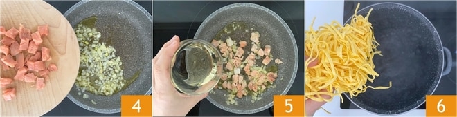 À ce moment-là, ajoutez le saumon 4 et faites-le revenir pendant quelques minutes en mélangeant souvent, puis salez. Augmentez légèrement la flamme et déglacez avec le vin blanc 5, en le laissant s'évaporer complètement. Pendant ce temps, faites cuire les tagliolini al dente 6 et gardez un peu d'eau de cuisson de côté.
