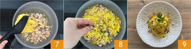 Une fois cuits, transférez les tagliolini directement dans la poêle avec le saumon 7 et faites sauter le tout à feu modéré, en mélangeant rapidement mais délicatement, pour bien amalgamer la sauce. Si nécessaire, vous pouvez ajouter une louche de l'eau de cuisson des pâtes que vous avez réservée. Éteignez le feu et garnissez avec le persil frais 8. Les tagliolini au saumon sont prêts à être servis 9 !