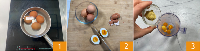 Pour préparer la mayonnaise japonaise, plongez 4 œufs dans une casserole d'eau froide ; à partir de l'ébullition comptez 10 minutes 1. Refroidissez-les dans de l'eau froide, puis écalez-les 2 et mettez dans le bol du mixeur uniquement les jaunes d'œufs et la moutarde 3. Utilisez les blancs pour d'autres recettes.
