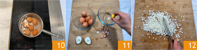 Passons à la préparation du tamago sandwich. Plongez 6 œufs dans une casserole d'eau froide, portez à ébullition et comptez 10 minutes 10. Refroidissez les œufs dans de l'eau froide puis écalez-les en séparant les jaunes et les blancs 11. Hachez grossièrement ces derniers au couteau 12.