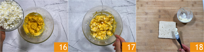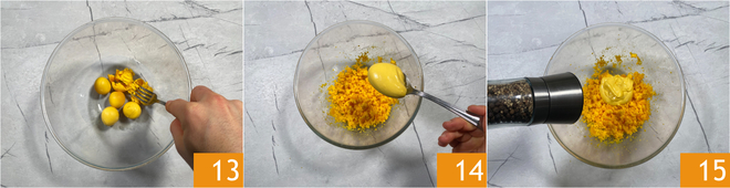 Écrasez les jaunes dans un bol 13 et ajoutez 100 grammes de mayonnaise japonaise 14, le sel et le poivre 15 ; mélangez bien.