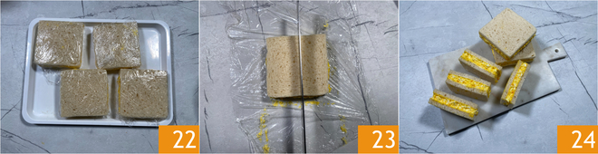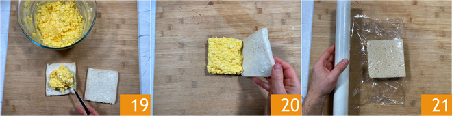 Garnissez généreusement avec la préparation aux œufs 19 et refermez en superposant une autre tranche beurrée 20. Emballez ensuite chaque sandwich dans du film alimentaire 21.