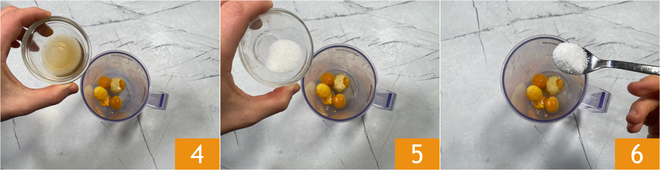 Ajoutez aussi le vinaigre 4, le sucre 5 et le sel 6.