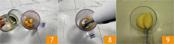 Enfin versez l'huile 7 et mixez au mixeur plongeant 8 jusqu'à obtenir une sauce lisse et compacte. Transférez-la dans un petit bol et conservez-la au réfrigérateur jusqu'à l'utilisation 9.