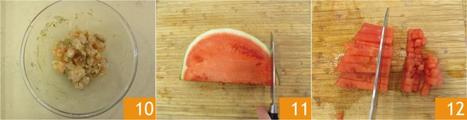 Mélangez pour parfumer 10. Conservez les crevettes au réfrigérateur pour mariner, entre-temps occupez-vous de la pastèque : coupez-la en tranches d'environ 1/2 cm, enlevez la peau 11 puis découpez des cubes d'environ 1/2 cm 12.