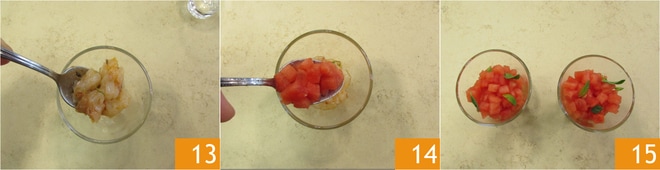 Composez maintenant vos verres : mettez la tartare de crevettes à la base du verre 13 placez la pastèque dessus 14 et garnissez avec des feuilles de menthe et de basilic, servez immédiatement la tartare de crevettes et pastèque 15.