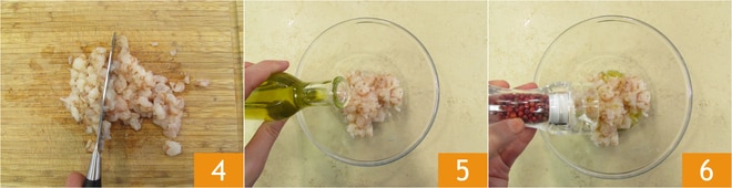 Hachez grossièrement les crevettes 4, mettez-les dans un bol et assaisonnez avec de l'huile 5, du sel et du poivre rose 6.