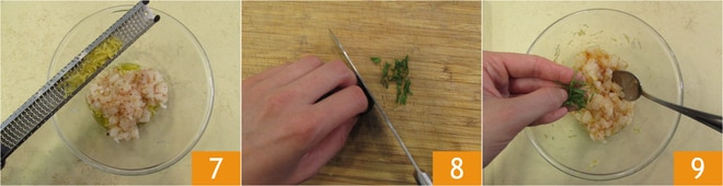 Parfumez avec le zeste de citron 7, hachez le basilic et la menthe 8 et ajoutez-les à la tartare 9.