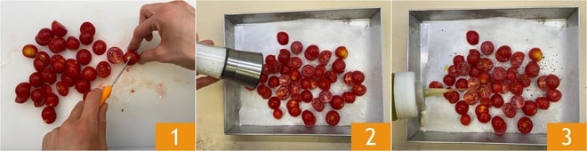Pour préparer la battuta de Fassona, lavez les tomates cerises et coupez-les en deux 1. Disposez-les sur une plaque et assaisonnez-les avec une pincée de sel 2, de poivre et un filet d'huile d'olive extra vierge 3. Faites cuire au four ventilé à 180° pendant 20 minutes.