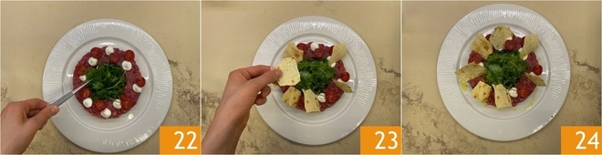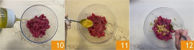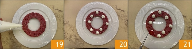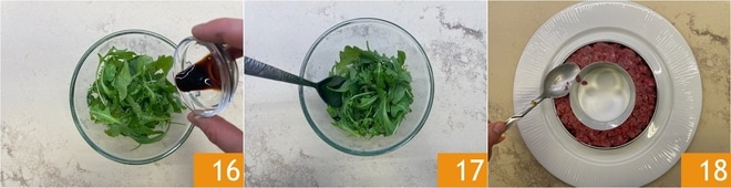Ajoutez également le vinaigre balsamique 16 et mélangez bien 17. Avec l'aide de 2 moules circulaires, formez un anneau de battuta de viande au centre de l'assiette 18; vous pouvez utiliser 2 emporte-pièces, un plus grand et un légèrement plus petit.