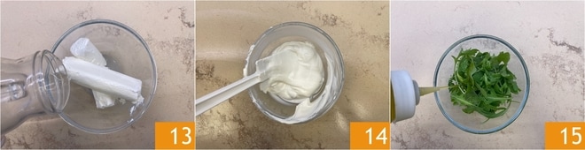 Dans un petit bol, versez le fromage de chèvre avec un peu d'eau 13, puis mélangez vigoureusement jusqu'à obtenir une crème lisse 14, que vous pourrez mettre dans une poche à douille pour plus de commodité. Assaisonnez la roquette avec une pincée de sel et un filet d'huile 15.