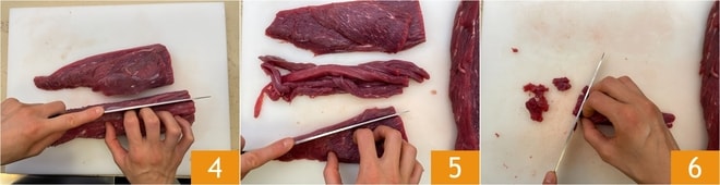 Entre-temps, nettoyez le faux-filet de Fassona en éliminant les parties nerveuses, coupez-le d'abord en tranches 4 puis en lamelles 5; enfin, réduisez-le en cubes 6.