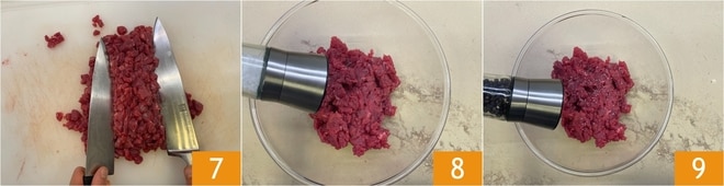 Avec 2 couteaux bien aiguisés, battez davantage la viande jusqu'à obtenir une texture fine, comme une tartare 7. Transférez-la dans un bol et assaisonnez avec une pincée de sel et un tour de moulin à poivre 9.