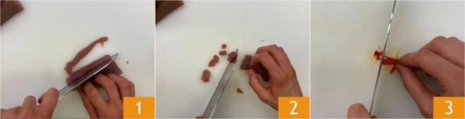 Pour préparer la tartare de thon mariné avec mangue et roquette, commencez par couper le thon d'abord en bandes 1 puis en cubes 2. Émincez finement le piment 3.