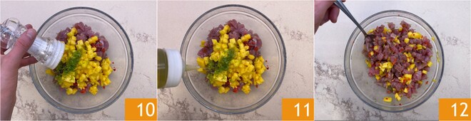 Assaisonnez de sel et de poivre 10, puis ajoutez un filet d'huile 11. Mélangez 12 et laissez reposer au réfrigérateur pendant 10 minutes.