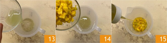 Entre-temps, préparez la sauce à la mangue: dans un mixeur, versez le jus de 2 limes 13, ajoutez l'autre moitié de la mangue, que vous aurez coupée grossièrement 14, et un filet d'huile 15.