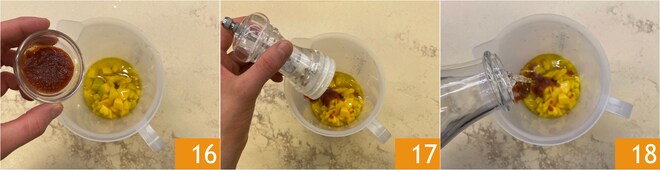 Ajoutez la sauce siracha 16, assaisonnez de sel 17 et versez l'eau 18.