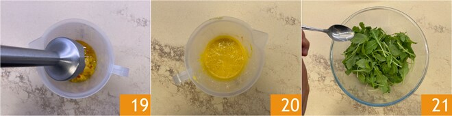 Mixez 19 jusqu'à obtenir une sauce lisse et homogène 20. Si elle est trop épaisse, vous pouvez ajouter un peu plus d'eau. Assaisonnez la roquette avec le jus de lime 21.