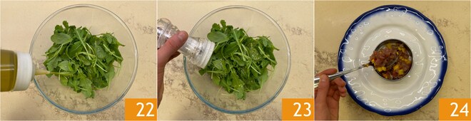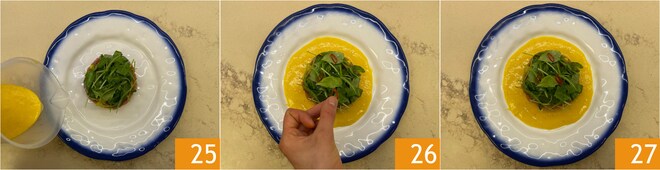 Ajoutez un filet d'huile 22 et une pincée de sel 23. Disposez un emporte-pièce de 10 cm de diamètre sur l'assiette et remplissez-le avec la tartare 24, puis pressez légèrement avec le dos de la cuillère.