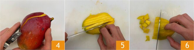 Épluchez la mangue 4 et divisez-la en deux: coupez une moitié d'abord en lamelles 5 puis en cubes 6.