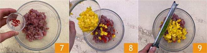 Dans un bol, mettez le thon, ajoutez le piment 7, la mangue 8 et le zeste de lime 9.