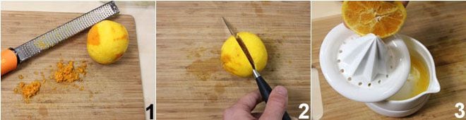 Pour préparer la tartare de thon, commencez par râper le zeste d'une orange 1, puis coupez-la en deux 2 et pressez-en le jus 3.