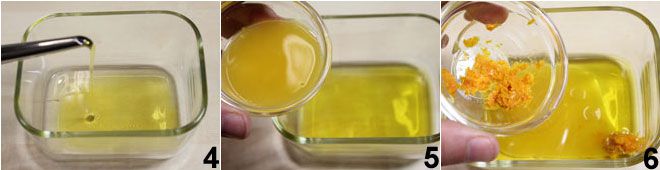 Dans un bol, versez l'huile d'olive extra vierge 4, le jus de l'orange 5 et son zeste 6.