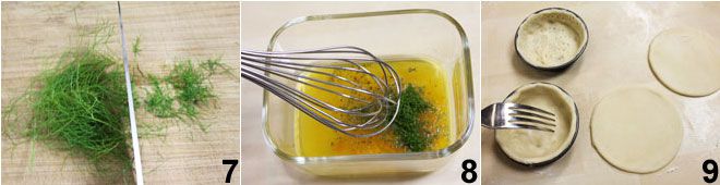 Hachez finement le fenouil 7, en réservant quelques brins pour la décoration finale, ajoutez-le au mélange et émulsionnez avec le fouet 8. Pendant ce temps, préparez les coques de pâte brisée. Ajustez l'émulsion avec une pincée de poivre et de sel. Préparez les coques de pâte brisée qui serviront à réaliser des portions individuelles de tartare : étalez la pâte brisée (vous pouvez utiliser un rouleau de pâte brisée déjà prête), découpez 10 cercles d'environ 10 cm de diamètre et tapissez 10 moules ronds de 8 cm de diamètre, après les avoir beurrés. Piquez le fond avec les dents d'une fourchette 9 et faites cuire à blanc, recouvert de légumineuses sèches comme poids, en suivant la technique de la cuisson à blanc Comment faire la cuisson à blanc, au four à 180 degrés pendant 10-15 minutes. Lorsqu'ils sont dorés, sortez-les du four, laissez-les refroidir et démoulez-les.