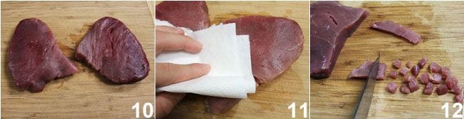 Prenez les tranches de thon : assurez-vous d'avoir acheté du poisson abattu. Il est recommandé de le congeler pendant 96 heures à -18 degrés et ensuite de le décongeler pour l'utiliser dans la recette 10. Rincez et séchez les filets de thon avec du papier absorbant 11. Coupez-les en petits cubes de 0,5 cm d'épaisseur 12 et transférez-les dans un grand bol.