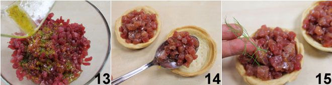 Versez dessus l'émulsion d'huile et d'orange 13 et mélangez pour que le thon soit bien imprégné. Remplissez ensuite les tartelettes avec une ou deux cuillères de tartare de thon 14 et décorez votre tartare avec quelques brins de fenouil 15.